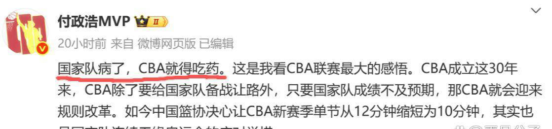 媒体人付政浩针对这一情况撰写长文指出:“国家队出了问题,CBA就得接受调整,这是我对CBA的主要看法。” 他认为,近30年来,CBA除了要顾及国家队备战需求外,只要国家队成绩低于预期,便会引发对CBA规则的改革。中国篮协决定将CBA新赛季单节比赛时间缩短为10分钟,也可以算作是国家队连续无缘奥运会后的一项举措。