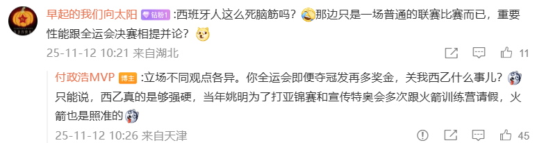 国内媒体人“付政浩MVP”也在网友的评论中回复道,“立场不同观点各异。你全运会即便夺冠发再多奖金,关我西乙什么事儿?只能说,西乙真的是够强硬,当年姚明为了打亚锦赛和宣传特奥会多次跟火箭训练营请假,火箭也是照准的。”