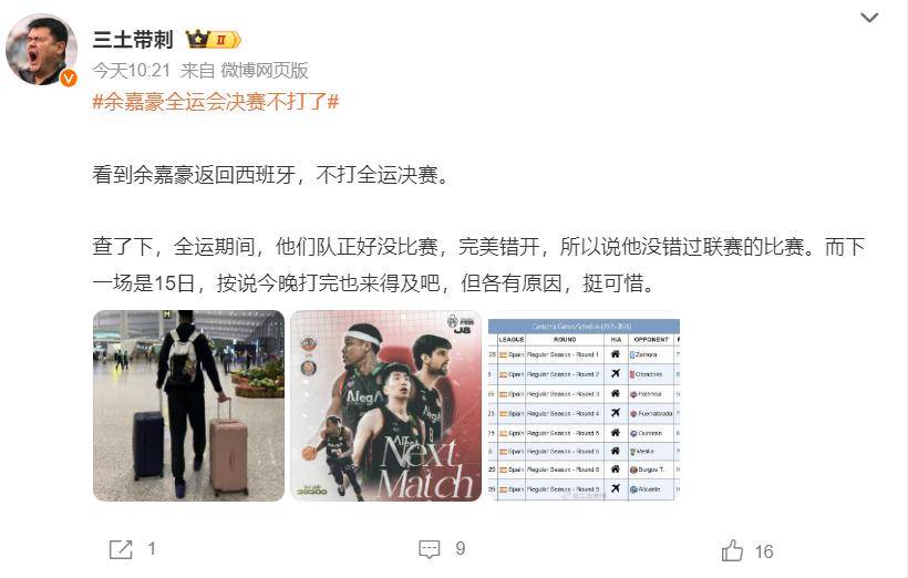 媒体人三土带刺也做出了相似的分析,表示全运会期间,埃斯特拉男篮并没有比赛,完美错开了时间窗口,因此余嘉豪并没有错过任何一场西乙的比赛。事实上,他打完决赛再走也完全来得及。
