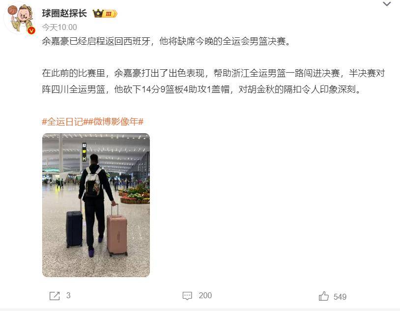 有意思的是,根据我查询的西乙赛程,埃斯特拉男篮的下一场比赛将是在11月15日,距全运会决赛仅有三天时间。为何不让余嘉豪完成最后一场比赛再返回呢?
