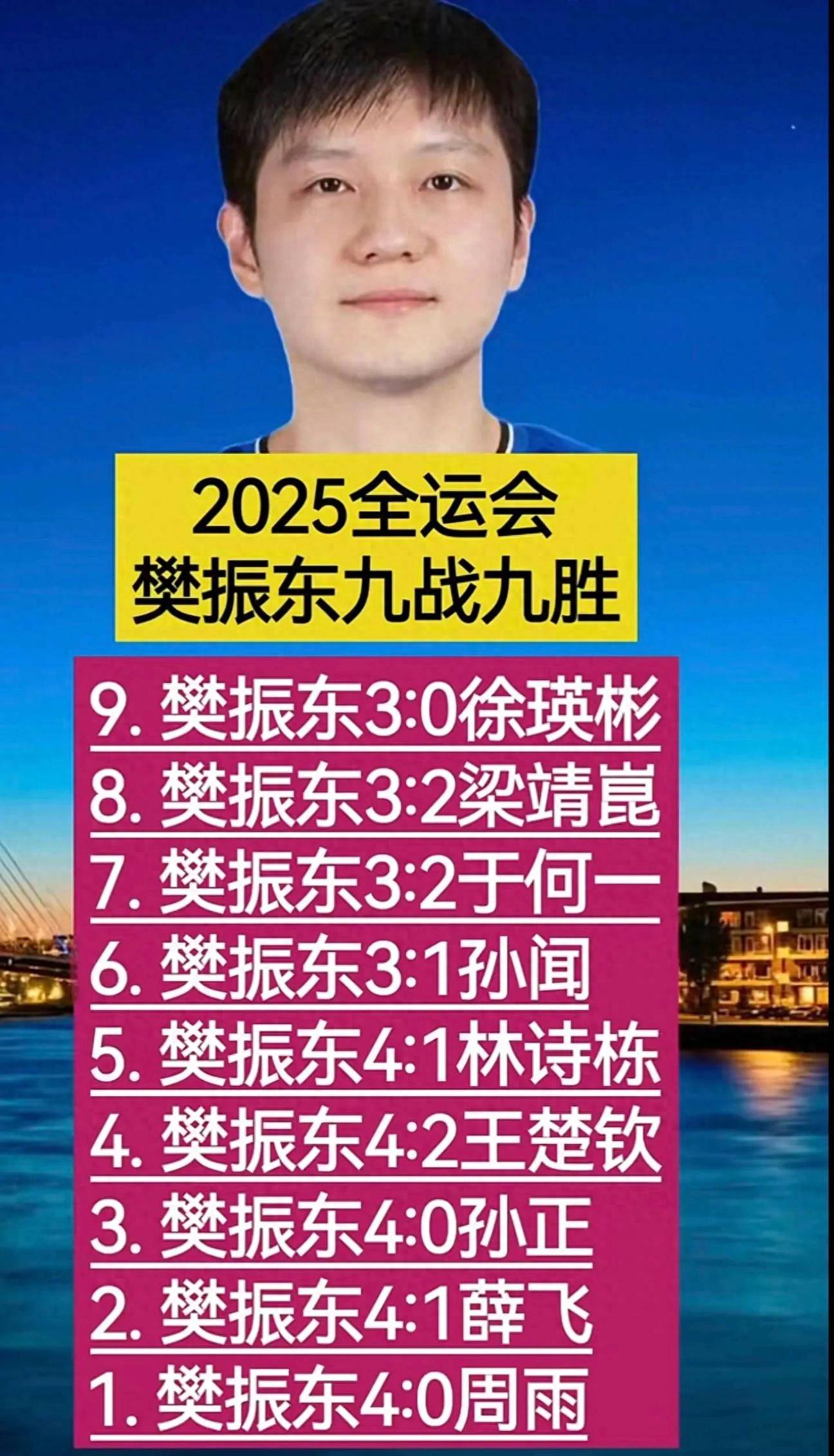 在这场精彩的全运会中,樊振东对阵多位国内顶级选手,展现了他无与伦比的实力。以下是他在比赛中的成绩: