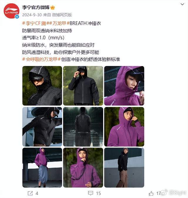 2024年5月,李宁与国家级科研机构合作推出防暴雨双透纳米科技,在户外装备面料领域开启应用;同年7月,李宁万龙甲冲锋衣系列和徒步鞋行川系列等户外产品开启线上首发。