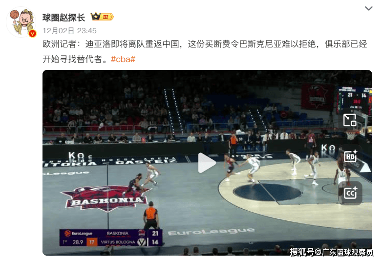 根据欧洲记者的报道,为了让迪亚洛能够回归CBA联赛,山西汾酒俱乐部支付了一笔令巴斯克尼亚篮球俱乐部难以拒绝的买断费。