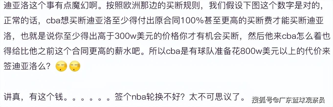 之前,某国内媒体人说迪亚洛的买断费用会超过800万美元以上,这个确实不太可能。欧洲篮球联赛那边买断费用最高也就是之前合同的1.5~2倍,也就是税后450~600万元美元左右。