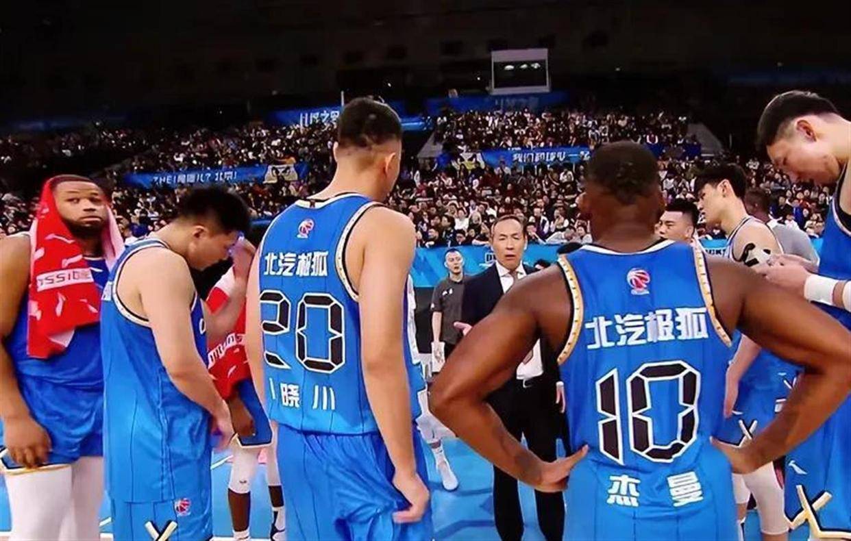 转播镜头捕捉到一个画面:第四节追分时刻,北京队球员在场上沟通明显不足。 一次防守中,两名球员同时扑向持球人,漏掉了底角的投手。 许利民立即叫暂停,但在白板上画战术时,有球员目光游离看向别处。