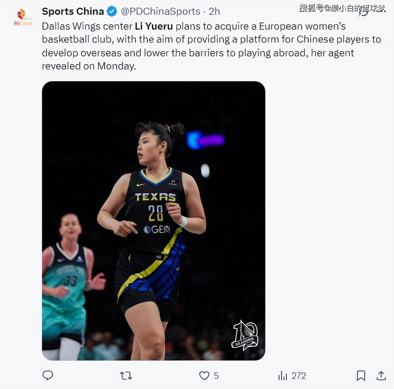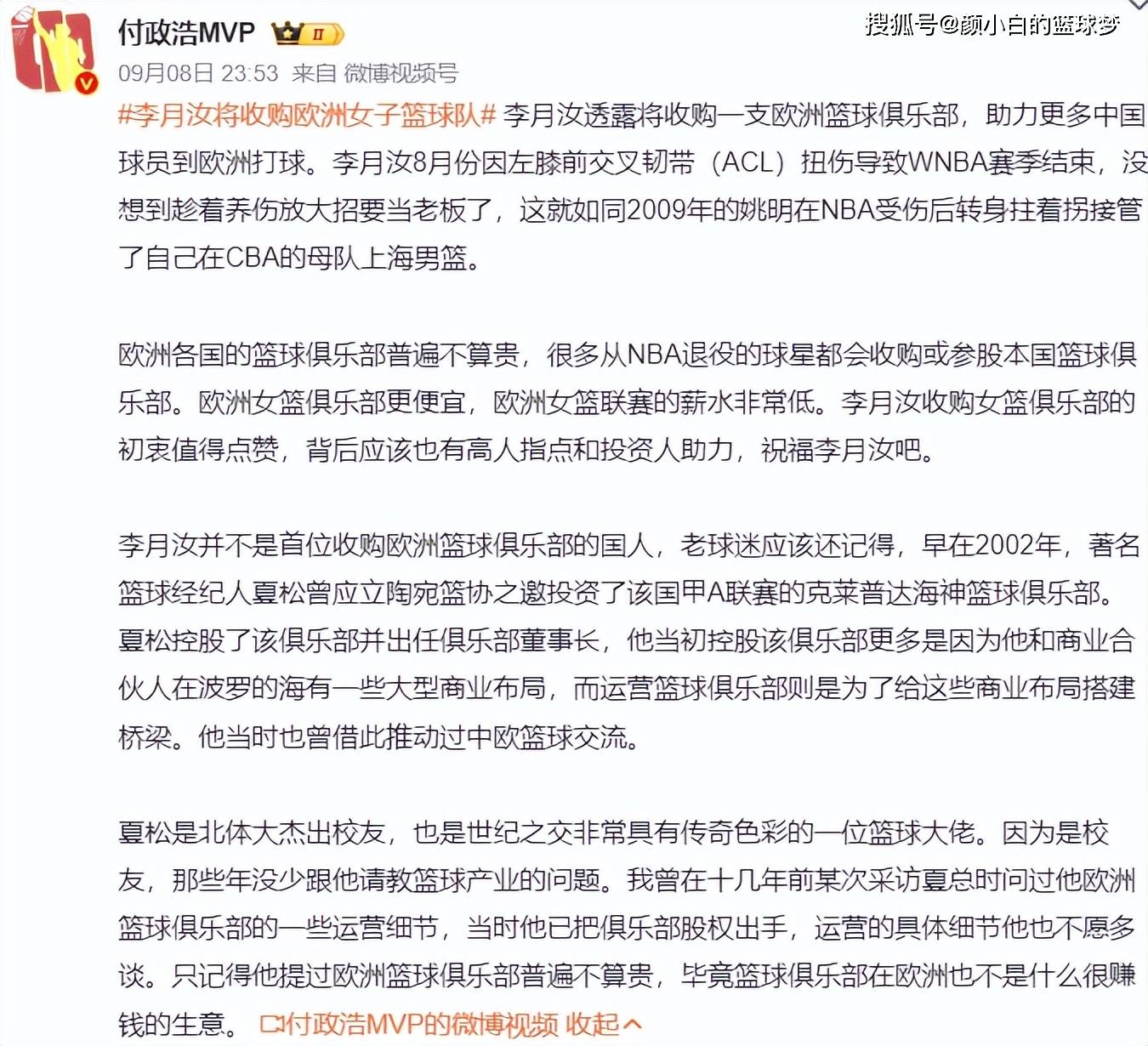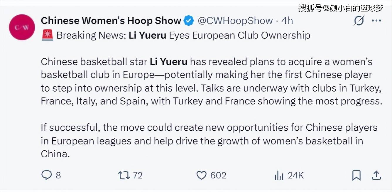 中国体育网也在海外社媒上发布了这一消息,达拉斯飞翼中锋李月汝经纪人在周一透露,李月汝正在计划收购一支欧洲女篮俱乐部,旨在为了帮助更多中国球员提供海外发展平台,降低她们留洋的门槛。
