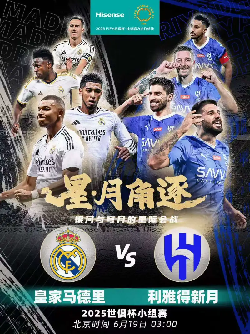 北京时间 6 月 19 日凌晨 3 点,2025 年世俱杯小组赛将迎来一场万众瞩目的焦点大战,欧洲足坛霸主皇家马德里将与亚洲劲旅利雅得新月正面交锋。这场比赛不仅是两支豪门球队的对垒,更是欧洲足球与亚洲足球的一次精彩对话,全球球迷的目光都将聚焦于此。