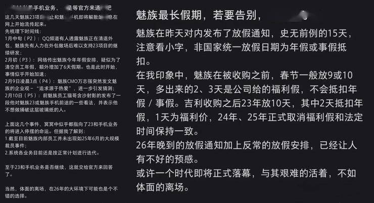 2月11日消息,近日,有网友爆料称魅族23项目已经停止,魅族手机业务即将解散。据该网友梳理的时间线月中旬QQ频道有人透露魅族正在清退外包人员,外包撤场后人力难以支撑23项目的继续研发。2月初,网传魅族今年年假安排通知,非国家统一放假日期需用年假或事假抵扣,疑似为清空员工年假而额外增加6天假期。2月10日,前魅族员工猫哥发布视频,对魅族23及手机业务前途发表看法,表示“不想做捅破这层玻璃纸的人”。