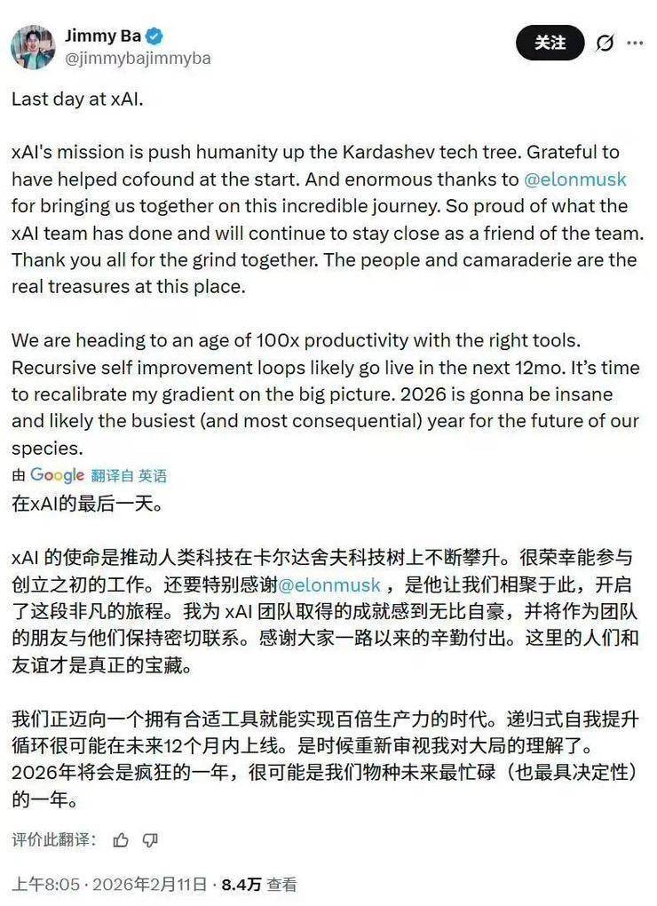 2 月 11 日消息,xAI 联合创始人吉米 · 巴(Jimmy Ba)表示,他已于当地时间周二离开埃隆 · 马斯克的这家初创公司。巴在社交平台上写道:“是时候重新校准我对大局的认知梯度了。2026 年将会非同寻常,很可能是关乎人类未来最忙碌(也最具决定性)的一年。”据知情人士透露,巴曾直接向马斯克汇报工作,此前负责公司的大部分业务,直到去年年底,他的多项职责被拆分给另外两位联合创始人托尼 · 吴(Tony Wu)与张国栋(Guodong Zhang,音译)。根据去年年初的一份组织架构图,巴此前还管理着一支负责超千名 AI 导师的团队,该职位已于去年 9 月交由迭戈 · 帕西尼(Diego Pasini)接任。