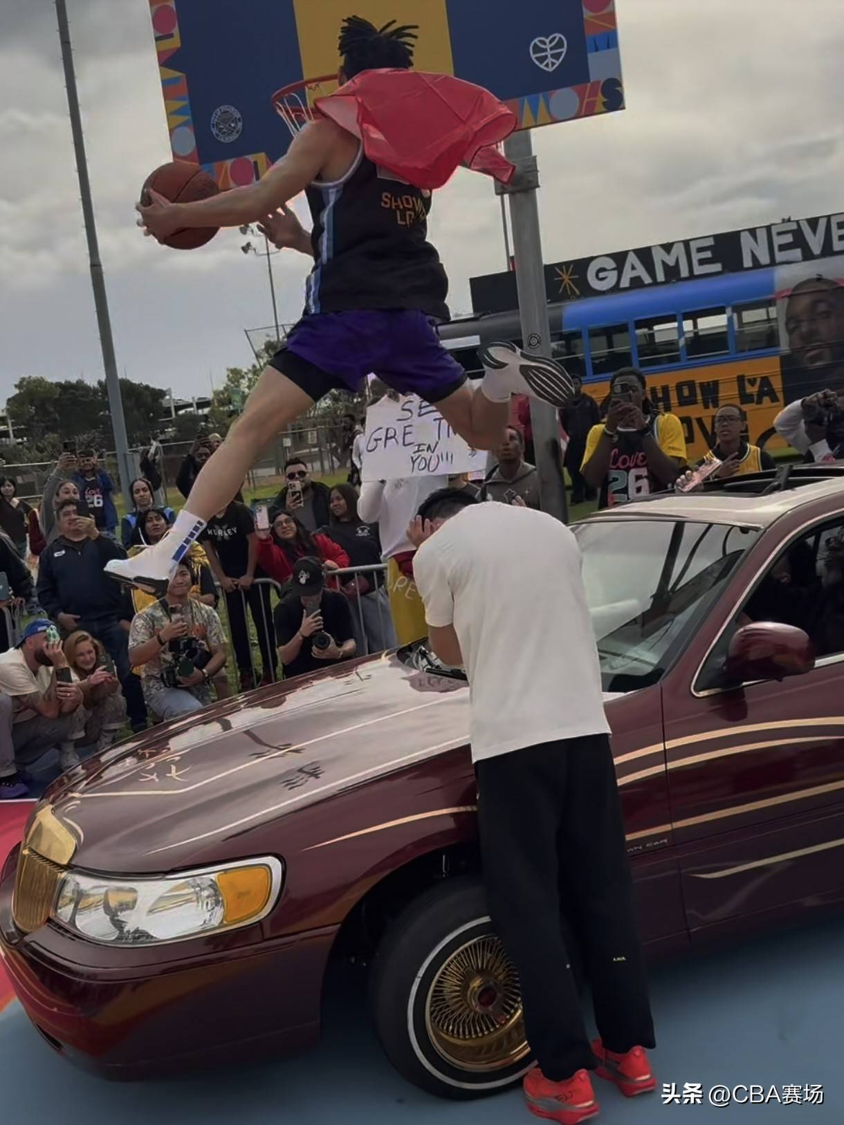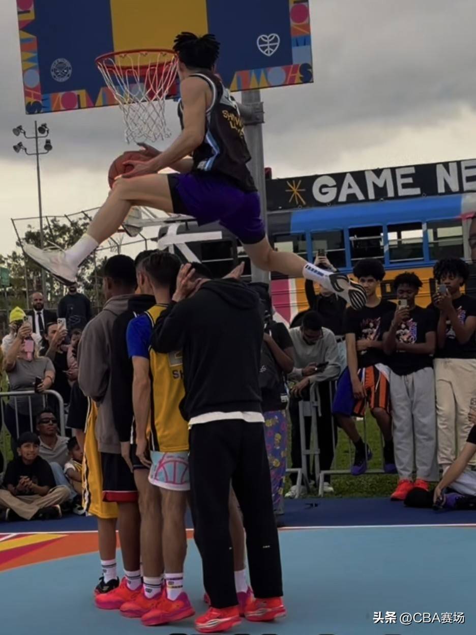这个扣篮大赛是街头性质的,但评委却是霍华德和迈克布朗两位前NBA扣篮大赛的冠军。陈登星的第一扣,选择了招牌动作,飞跃多人的胯下扣篮;第二扣,是单手揽月的胯下扣篮动作;第三扣,他穿着霍华德递过来的超人战袍,完成了飞跃汽车的扣篮。